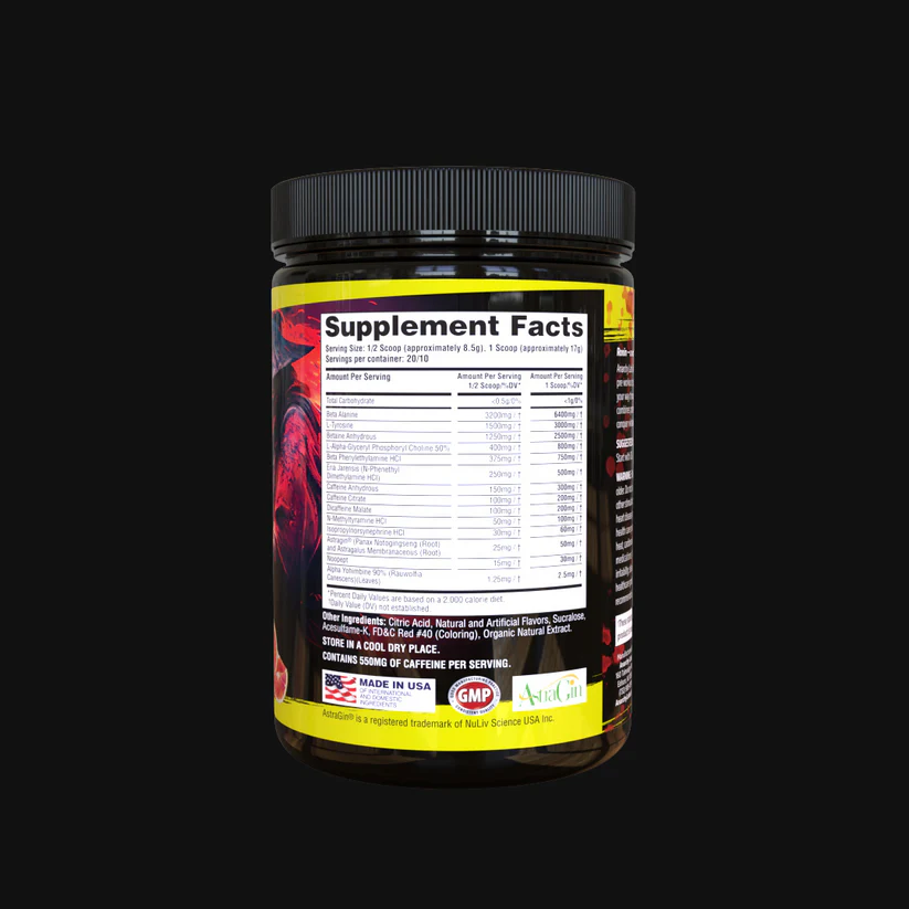 Hardcore and Aggressive Preworkout | 700mg Caffeine | 500mg Eria Jarensis | 6.4gms of Beta Alanine | 30mg Noopept