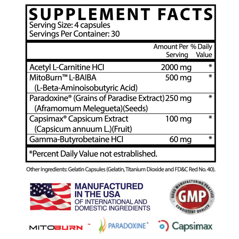 – MitoBurn (L-BIABA) is a trademarked ingredient which is a myokine released during exercise that helps promote fat loss, improve insulin sensitivity, and enhance energy expenditure.